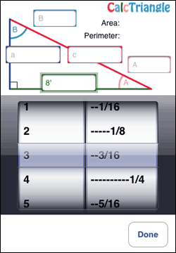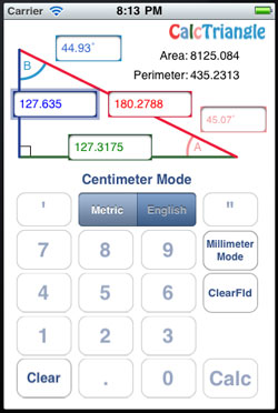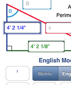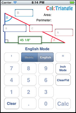Our app is easier to use than others we have seen because you do not use the default numbers screen and you do not have to shift from one screen to another to enter data. Just select any two sides or any side and any angle and enter the dimensions you have. they can be done in foot mode, inch mode or decimal.